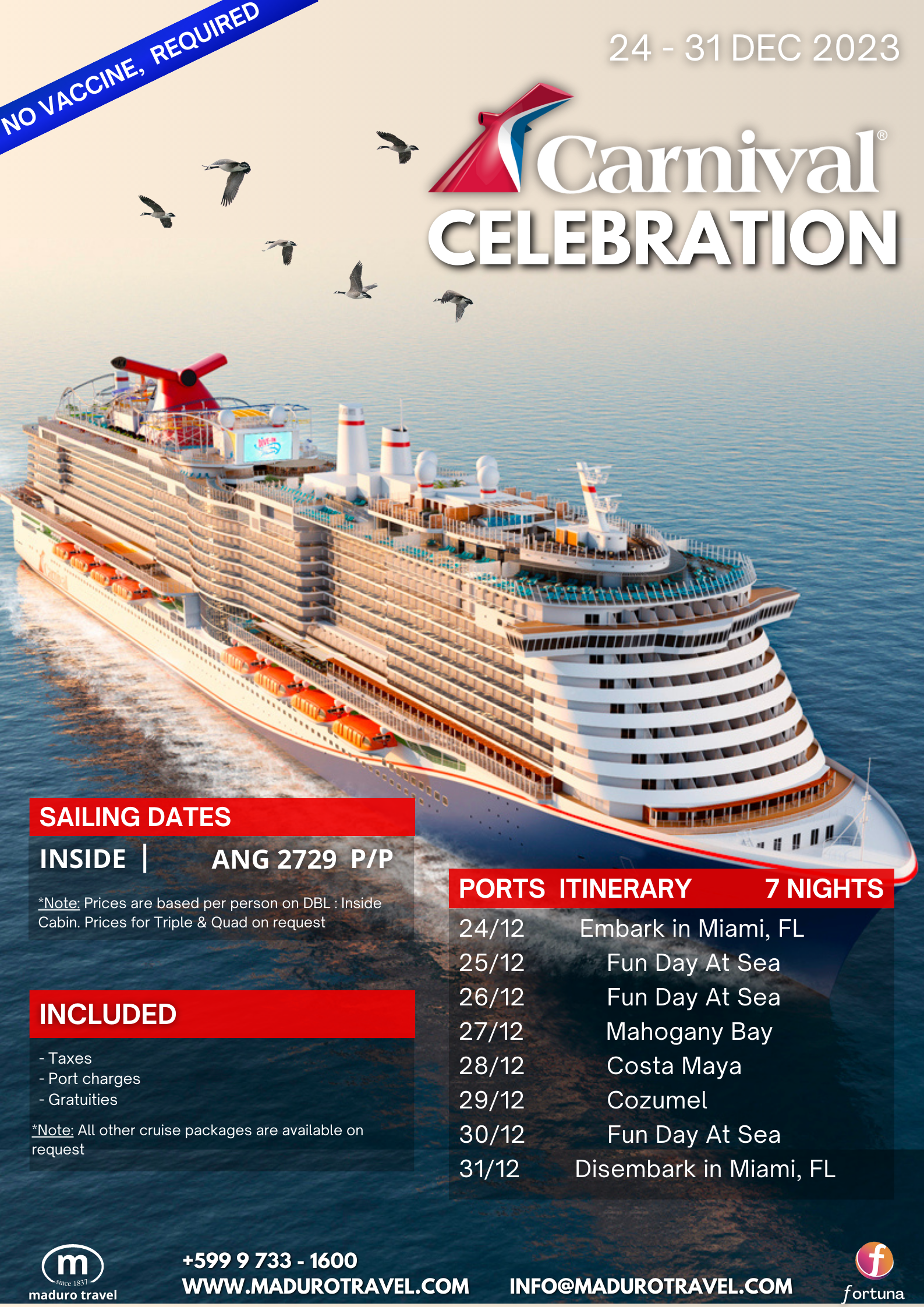 - Airfare CUR – Miami – CUR starting from NAF 1410,00